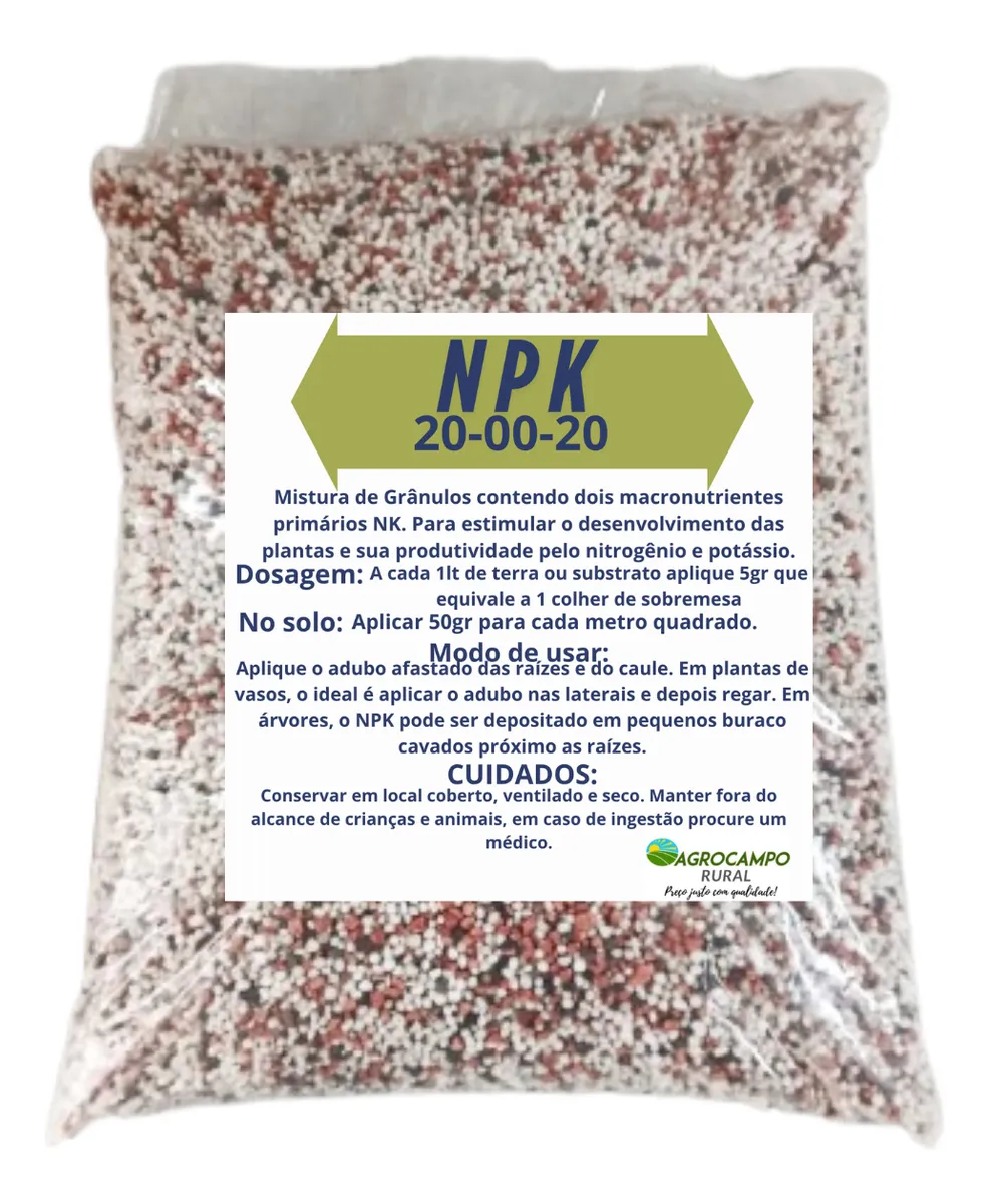 O 20-00-20 é um adubo do tipo formulado NPK, que possui a seguinte concentração de nutrientes: 20% de Nitrogênio, 0% de P2O5 (fósforo) e 20% de K2O (potássio). Isto quer dizer que a cada 100 kg do adubo, 20 Kg são de N, 0 kg de P2O5% e 20 kg de K2O.